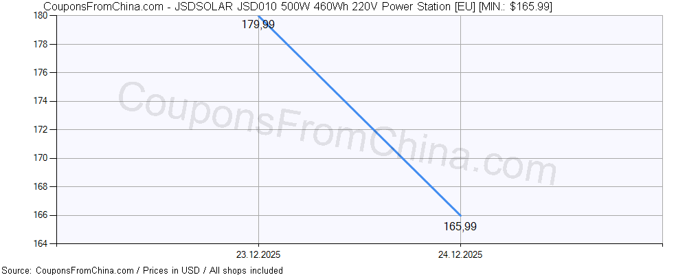 Price history (for all/most countries) for JSDSOLAR JSD010 500W 460Wh 220V Power Station [EU] is here. The lowest price was: $165.99.