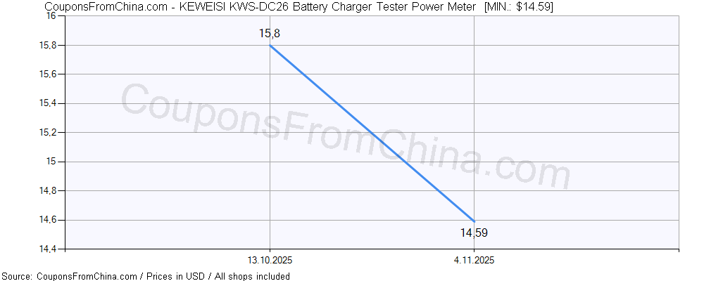 Do you need price history chart (for all/most countries) for KEWEISI KWS-DC26 Battery Charger Tester Power Meter ? There we go. The lowest price was: $14.59.