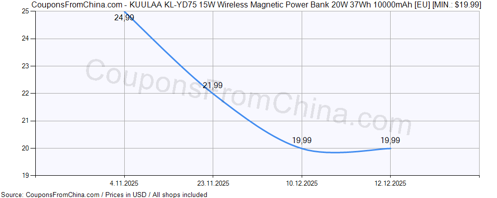 Check out price history chart (for all/most countries) for KUULAA KL-YD75 15W Wireless Magnetic Power Bank 20W 37Wh 10000mAh [EU]. The lowest price was: $19.99.