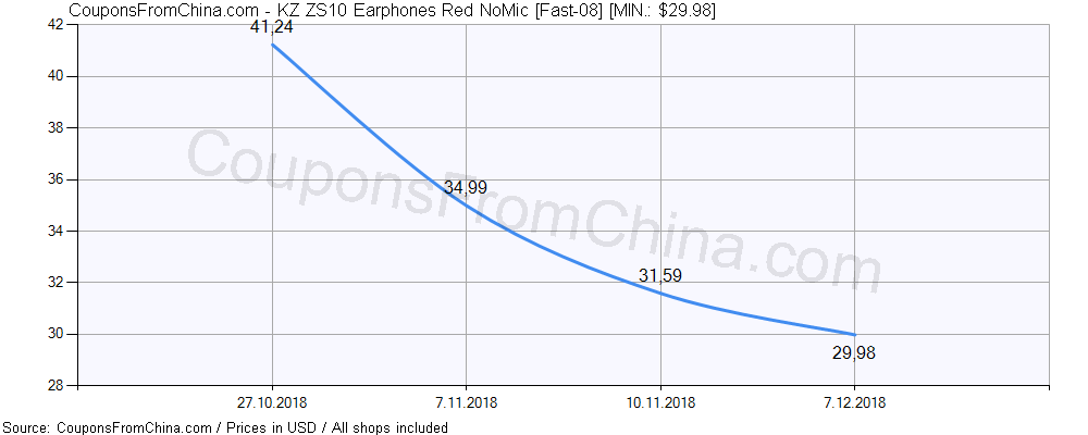 Do you need price history chart (for all/most countries) for KZ ZS10 Earphones Red NoMic [Fast-08]? There we go. The lowest price was: $29.98.