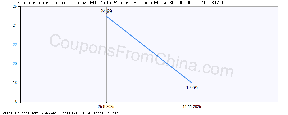 Check out price history chart (for all/most countries) for Lenovo M1 Master Wireless Bluetooth Mouse 800-4000DPI. The lowest price was: $17.99.