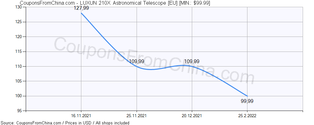 Do you need price history chart (for all/most countries) for LUXUN 210X Astronomical Telescope [EU]? There we go. The lowest price was: $99.99.
