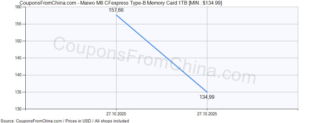 Price history (for all/most countries) for Maiwo M6 CFexpress Type-B Memory Card 1TB is here. The lowest price was: $134.99.