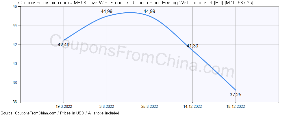 Do you need price history chart (for all/most countries) for ME98 Tuya WiFi Smart LCD Touch Floor Heating Wall Thermostat [EU]? There we go. The lowest price was: $37.25.
