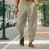 Men Pants with Drawstring Breathable Solid Color Cotton Linen Stretch Elastic Trousers for Daily Wear