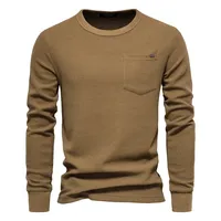 Waffle cotton spring 2025 new solid color men’s T-shirt single pocket long sleeve men’s T-shirt comfortable breathable shirt men