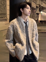 Men’s Winter V Neck Fur-lined Faux Fur Coat Thickened Cotton-padded Warm Insulated Jacket Stylish Outerwear Chic Parkas