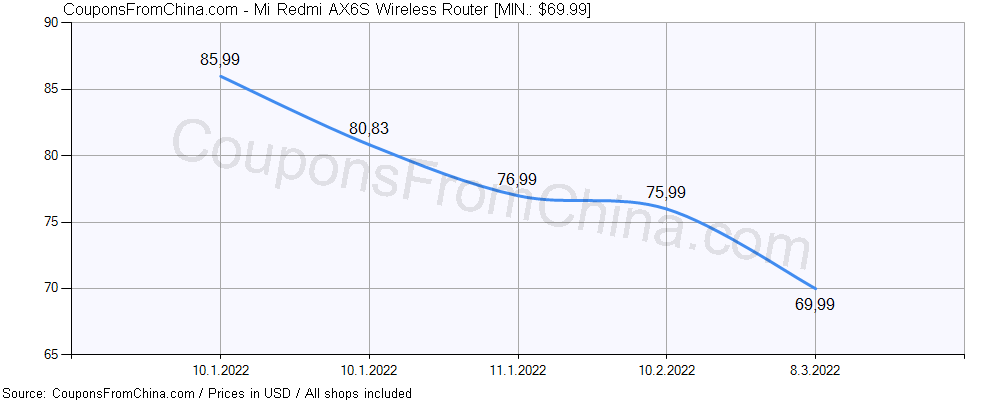 Check out price history chart (for all/most countries) for Mi Redmi AX6S Wireless Router. The lowest price was: $48.35.