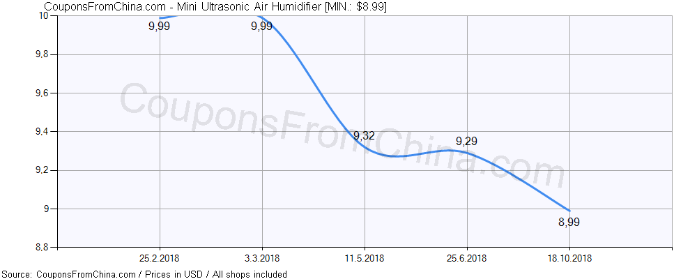 Do you need price history chart (for all/most countries) for Mini Ultrasonic Air Humidifier? There we go. The lowest price was: $8.99.