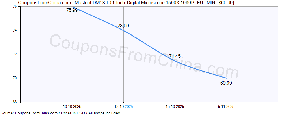 Here is price history (for all/most countries) for Mustool DM13 10.1 Inch Digital Microscope 1500X 1080P [EU]. The lowest price was: $69.99.