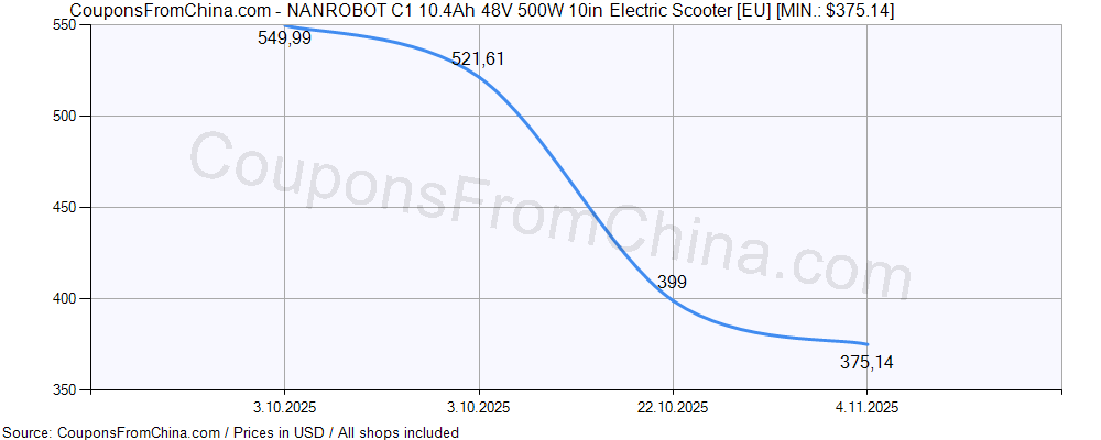 Check out price history chart (for all/most countries) for NANROBOT C1 10.4Ah 48V 500W 10in Electric Scooter [EU]. The lowest price was: $375.14.