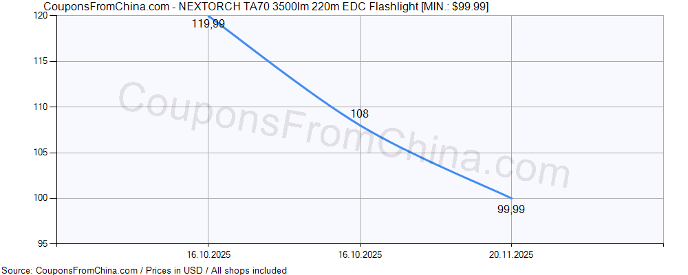 Check out price history chart (for all/most countries) for NEXTORCH TA70 3500lm 220m EDC Flashlight. The lowest price was: $99.99.