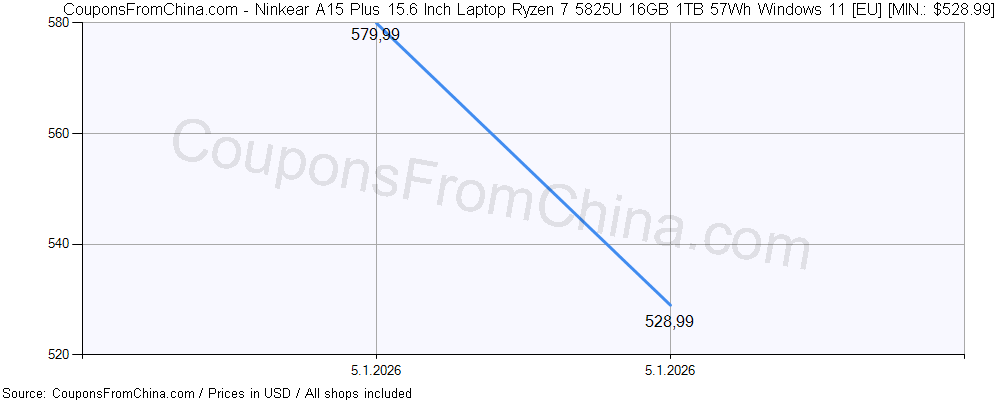 Here is price history (for all/most countries) for Ninkear A15 Plus 15.6 Inch Laptop Ryzen 7 5825U 16GB 1TB 57Wh Windows 11 [EU]. The lowest price was: $528.99.