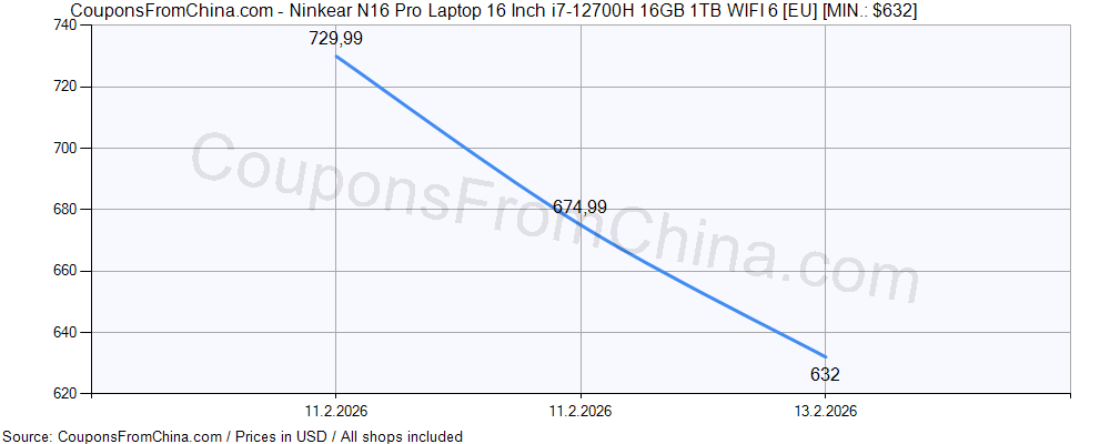 Price history (for all/most countries) for Ninkear N16 Pro Laptop 16 Inch i7-12700H 16GB 1TB WIFI 6 [EU] is here. The lowest price was: $632.