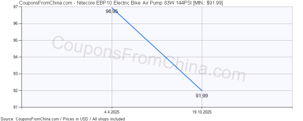 Do you need price history chart (for all/most countries) for Nitecore EBP10 Electric Bike Air Pump 83W 144PSI? There we go. The lowest price was: $91.99.