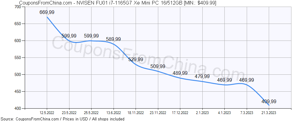 Do you need price history chart (for all/most countries) for NVISEN FU01 i7-1165G7 Xe Mini PC 16/512GB? There we go. The lowest price was: $409.99.