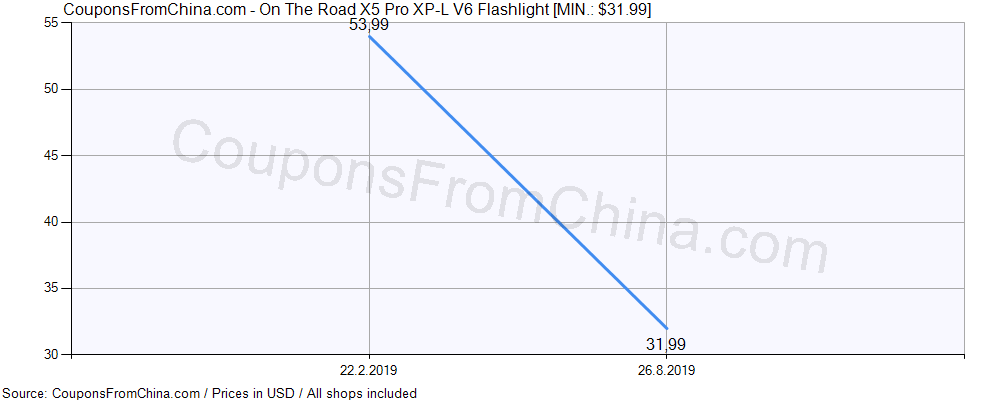 Price history (for all/most countries) for On The Road X5 Pro XP-L V6 Flashlight is here. The lowest price was: $31.99.
