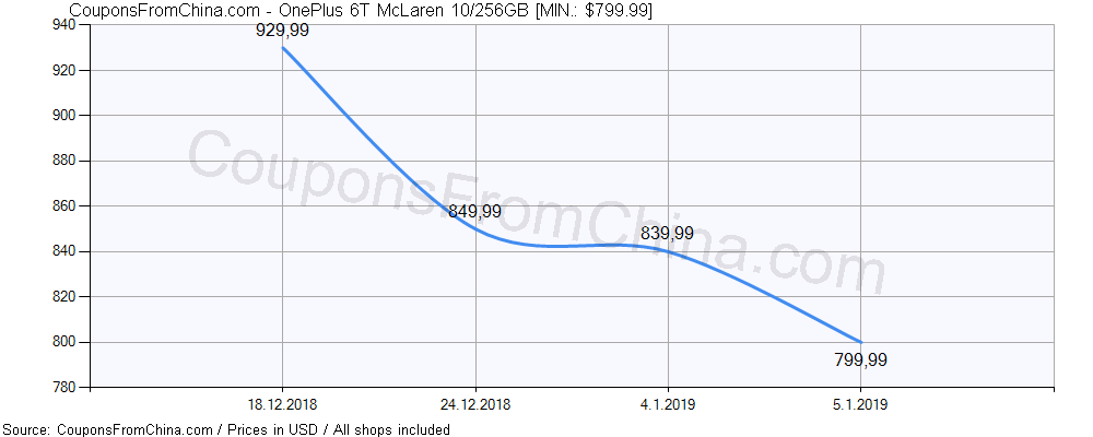 Here is price history (for all/most countries) for OnePlus 6T McLaren 10/256GB. The lowest price was: $799.99.