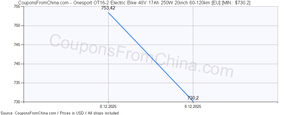 Here is price history (for all/most countries) for Onesport OT16-2 Electric Bike 48V 17Ah 250W 20inch 60-120km [EU]. The lowest price was: $730.2.