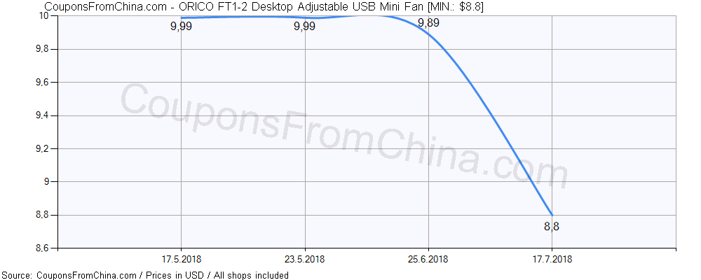 Check out price history chart (for all/most countries) for ORICO FT1-2 Desktop Adjustable USB Mini Fan. The lowest price was: $8.8.