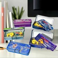 Dollhouse Miniature Double Layer Iron Pencil Box Pen Ruler Measuring Tape Scissors Model Micro Landscape Decor Pretend Play Toy