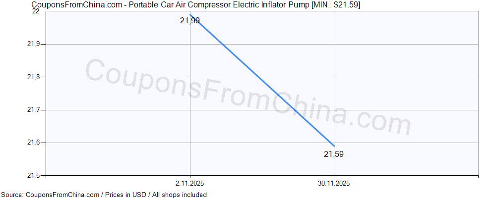 Price history (for all/most countries) for Portable Car Air Compressor Electric Inflator Pump is here. The lowest price was: $21.59.