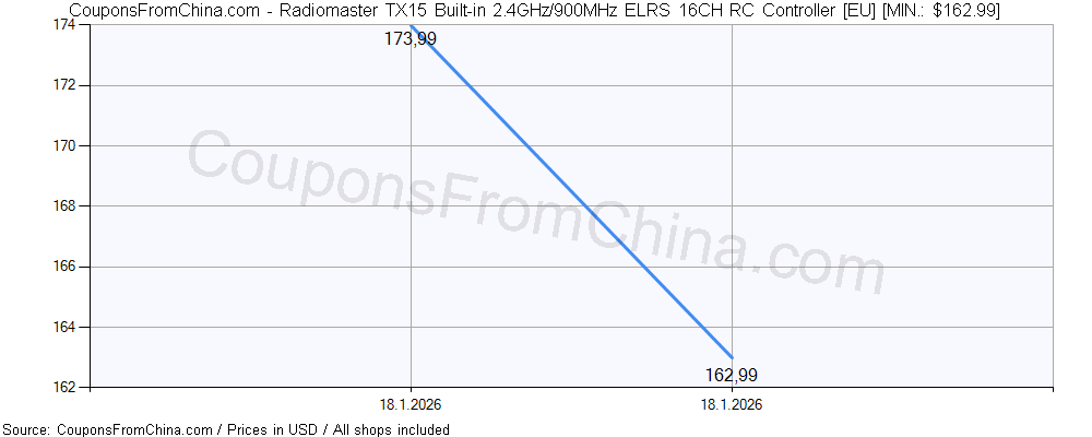Do you need price history chart (for all/most countries) for Radiomaster TX15 Built-in 2.4GHz/900MHz ELRS 16CH RC Controller [EU]? There we go. The lowest price was: $162.99.