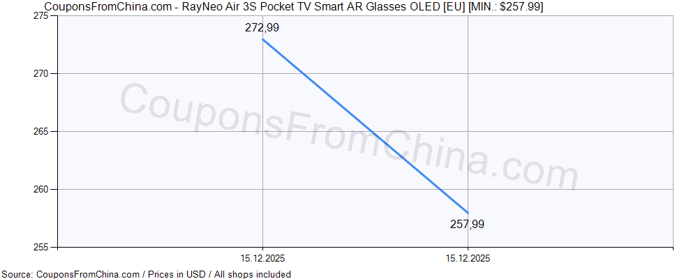 Click on image to enlarge. ![RayNeo Air 3S Pocket TV Smart AR Glasses OLED [EU] price history Price history for RayNeo Air 3S Pocket TV Smart AR Glasses OLED [EU]](https://couponsfromchina.com/pricehistory/History55057.png)