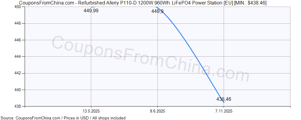 Price history (for all/most countries) for Refurbished Aferiy P110-D 1200W 960Wh LiFePO4 Power Station [EU] is here. The lowest price was: $438.46.