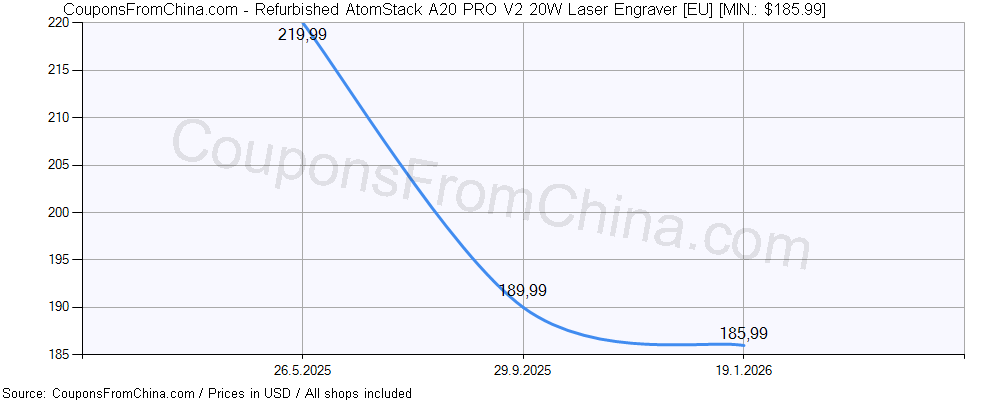 Do you need price history chart (for all/most countries) for Refurbished AtomStack A20 PRO V2 20W Laser Engraver [EU]? There we go. The lowest price was: $185.99.