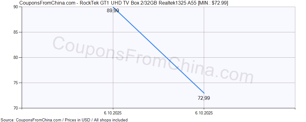 Check out price history chart (for all/most countries) for RockTek GT1 UHD TV Box 2/32GB Realtek1325 A55. The lowest price was: $72.99.