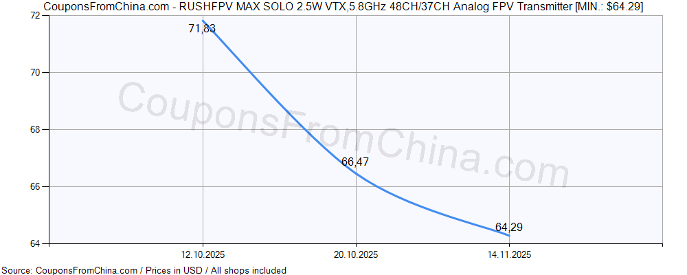 Here is price history (for all/most countries) for RUSHFPV MAX SOLO 2.5W VTX,5.8GHz 48CH/37CH Analog FPV Transmitter. The lowest price was: $64.29.