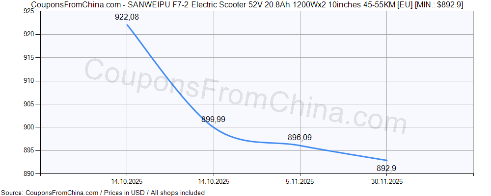 Check out price history chart (for all/most countries) for SANWEIPU F7-2 Electric Scooter 52V 20.8Ah 1200Wx2 10inches 45-55KM [EU]. The lowest price was: $892.9.