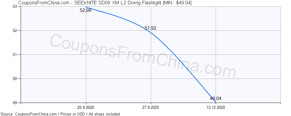 Here is price history (for all/most countries) for SEEKNITE SD08 XM L2 Diving Flashlight. The lowest price was: $49.04.