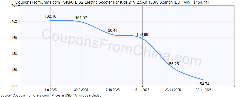 Here is price history (for all/most countries) for SIMATE S2 Electric Scooter For Kids 24V 2.5Ah 130W 6.5inch [EU]. The lowest price was: $154.74.