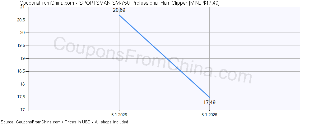 Check out price history chart (for all/most countries) for SPORTSMAN SM-750 Professional Hair Clipper. The lowest price was: $17.49.
