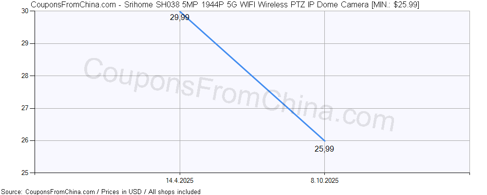 Do you need price history chart (for all/most countries) for Srihome SH038 5MP 1944P 5G WIFI Wireless PTZ IP Dome Camera? There we go. The lowest price was: $25.99.