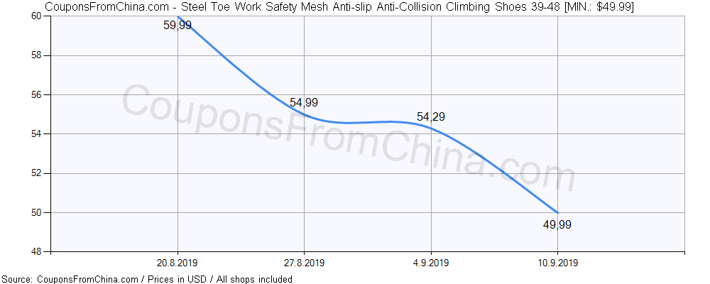 Do you need price history chart (for all/most countries) for Steel Toe Work Safety Mesh Anti-slip Anti-Collision Climbing Shoes 39-48? There we go. The lowest price was: $49.99.