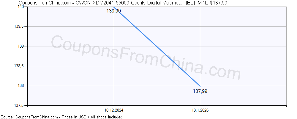 Here is price history (for all/most countries) for OWON XDM2041 55000 Counts Digital Multimeter [EU]. The lowest price was: $137.99.