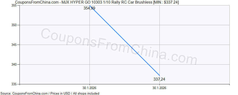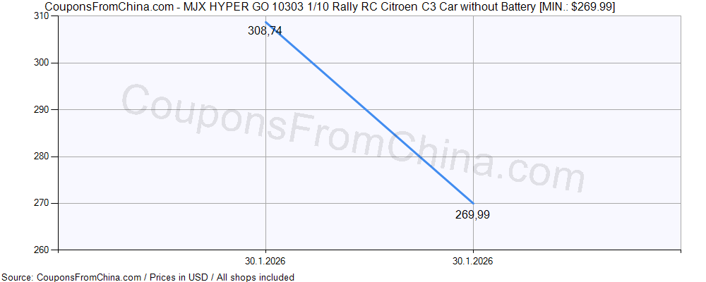 Check out price history chart (for all/most countries) for MJX HYPER GO 10303 1/10 Rally RC Citroen C3 Car without Battery. The lowest price was: $269.99.