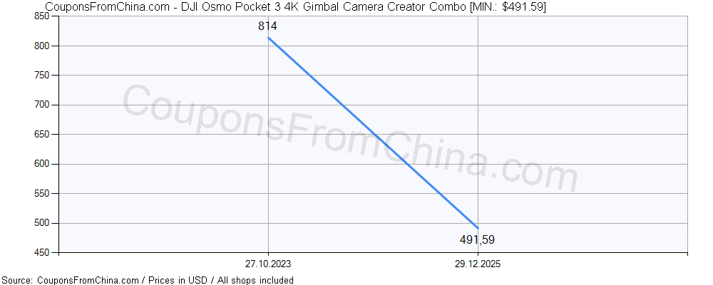 Here is price history (for all/most countries) for DJI Osmo Pocket 3 4K Gimbal Camera Creator Combo. The lowest price was: $491.59.