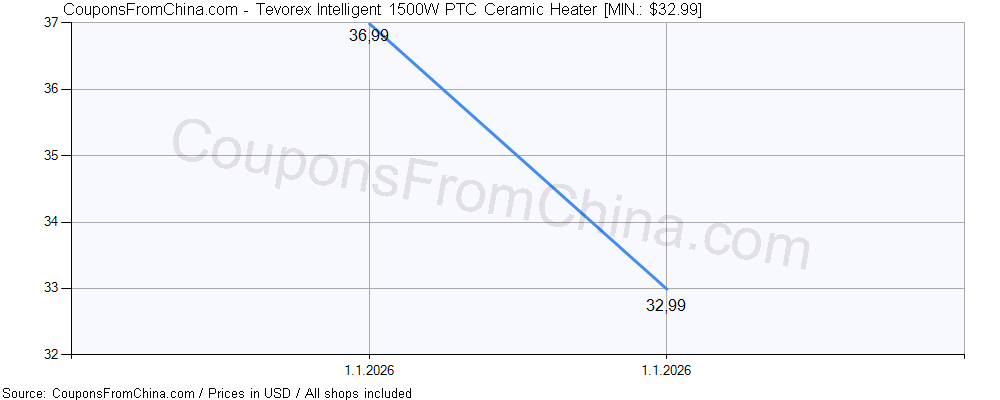 Do you need price history chart (for all/most countries) for Tevorex Intelligent 1500W PTC Ceramic Heater? There we go. The lowest price was: $32.99.