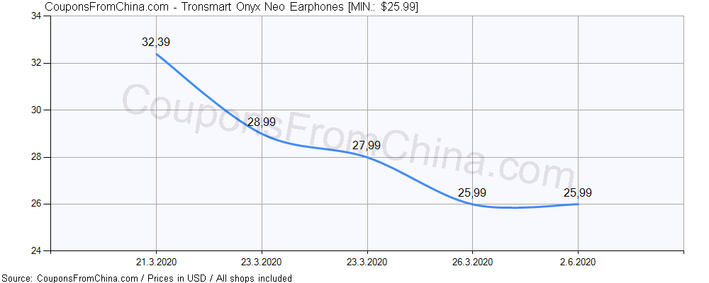 Check out price history chart (for all/most countries) for Tronsmart Onyx Neo Earphones. The lowest price was: $25.99.