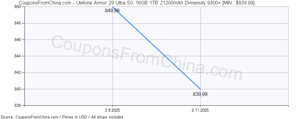 Do you need price history chart (for all/most countries) for Ulefone Armor 29 Ultra 5G 16GB 1TB 21200mAh Dimensity 9300+? There we go. The lowest price was: $839.99.