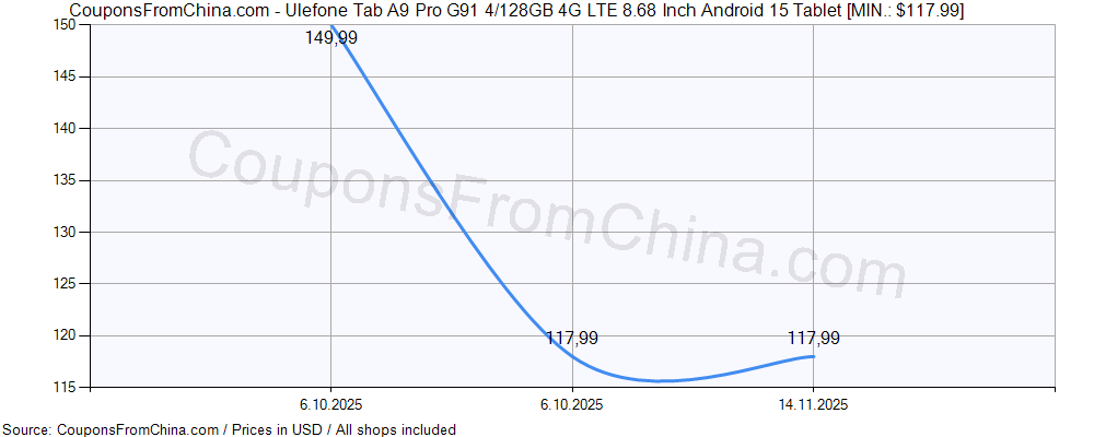 Check out price history chart (for all/most countries) for Ulefone Tab A9 Pro G91 4/128GB 4G LTE 8.68 Inch Android 15 Tablet. The lowest price was: $117.99.