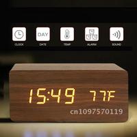 Digital LED Wooden Alarm Clock With Temperature Voice Control Snooze Electronic Desk Clock USB AAA Power Supply Decorations Home