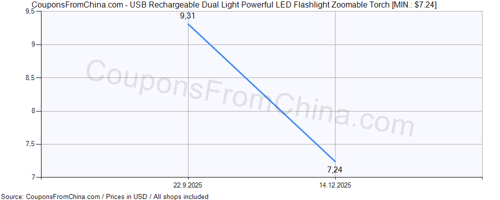 Do you need price history chart (for all/most countries) for USB Rechargeable Dual Light Powerful LED Flashlight Zoomable Torch? There we go. The lowest price was: $7.24.