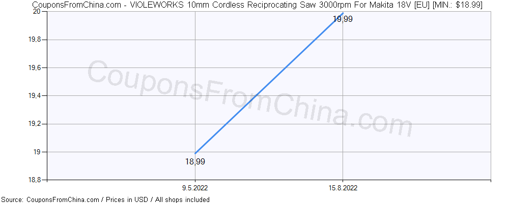 Check out price history chart (for all/most countries) for VIOLEWORKS 10mm Cordless Reciprocating Saw 3000rpm For Makita 18V [EU]. The lowest price was: $18.99.