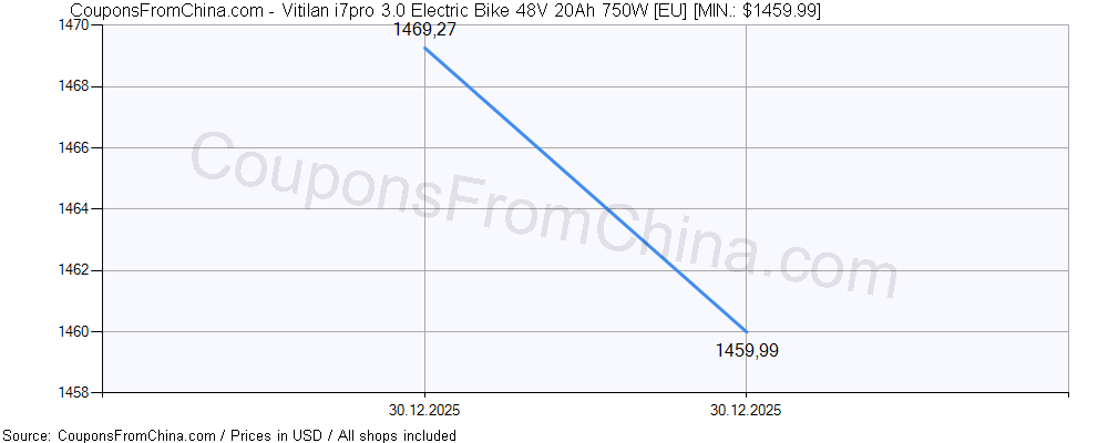 Do you need price history chart (for all/most countries) for Vitilan i7pro 3.0 Electric Bike 48V 20Ah 750W [EU]? There we go. The lowest price was: $1459.99.