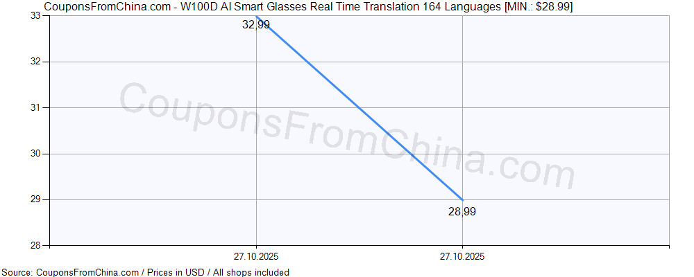 Here is price history (for all/most countries) for W100D AI Smart Glasses Real Time Translation 164 Languages. The lowest price was: $28.99.